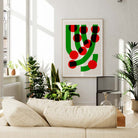 Our Green Grass abstract print combines solid green bands with layered red circles on a neutral background. The shapes are repeated but not rigid, creating a loose visual rhythm. Matches well with our other abstract prints, or browse our green prints if you're looking to match the tone.