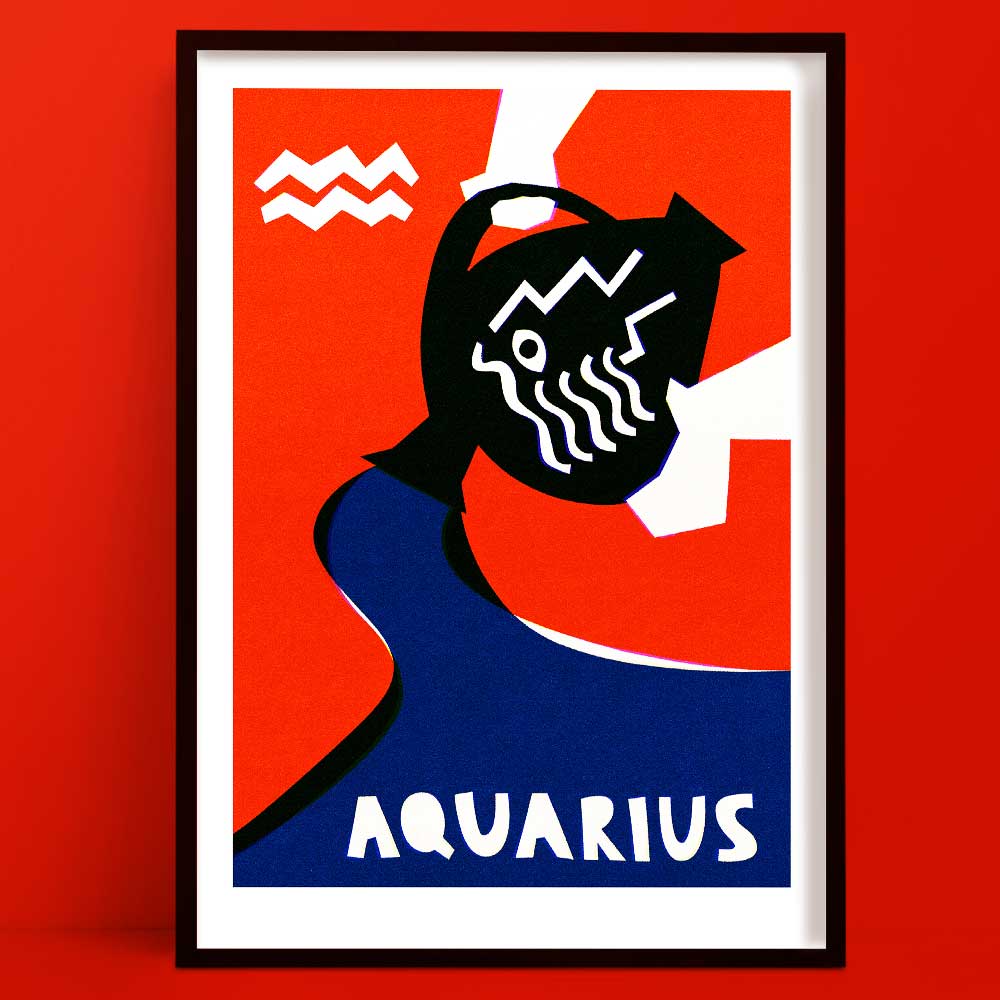 Hands pour a river from a jar in our red and blue Aquarius print. Both bold and soothing at the same time, due to the contrast in colour and water-based imagery, it's a great match for our other colourful prints and the rest of our Star Sign series.