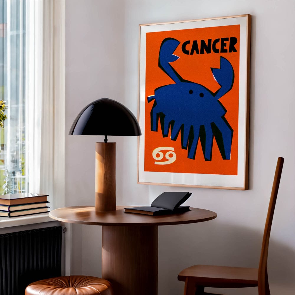 Featuring a strong crab form in orange and blue, our Cancer Star Sign print is part of our Star Sign Print series inspired by vintage matchbook art. Works well in a living room or bedroom, especially when paired with our other colourful prints.