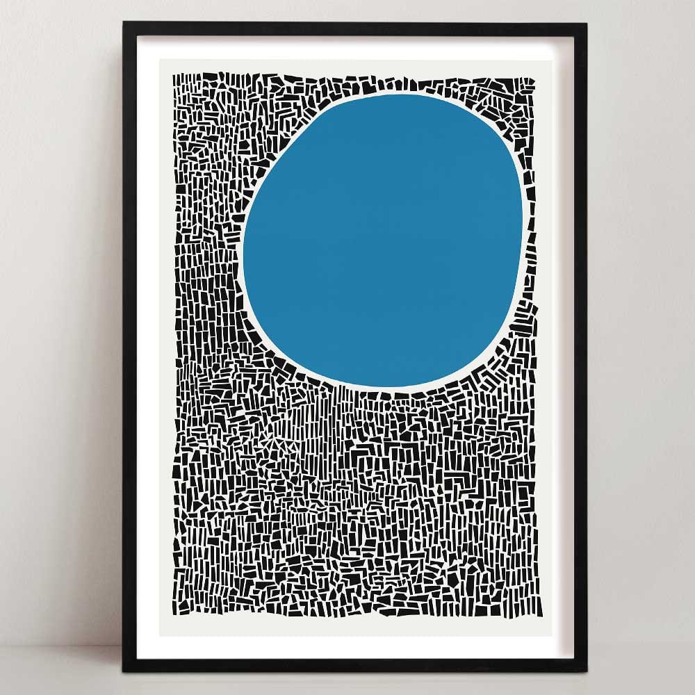 Our Blue Lake abstract art print draws from the shapes of our city collection, placing a solid blue form within a field of our distinctive abstract shapes. This abstract poster keeps things visually striking but uncluttered. Perfect as a large abstract art piece on its own, or match it with our ‘City Sunset’ and ‘Rain and Sun’ prints.