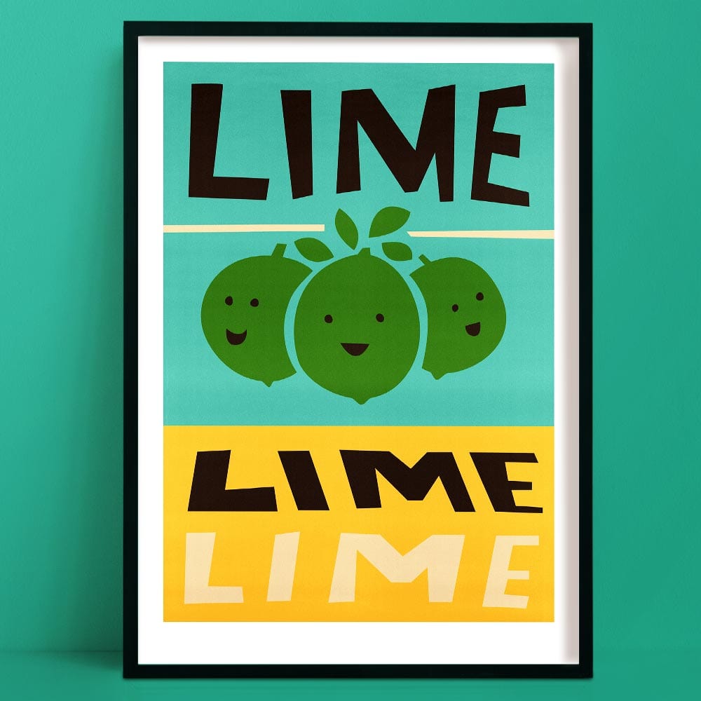 Crisp and refreshing, our Lime print brings sharp contrast and fun to your walls with our happy trio of smiling limes. Use it as a bright accent in a kitchen or dining space, or pair it with our Oranges or Watermelon prints to continue the fruit theme along your walls.