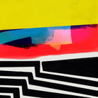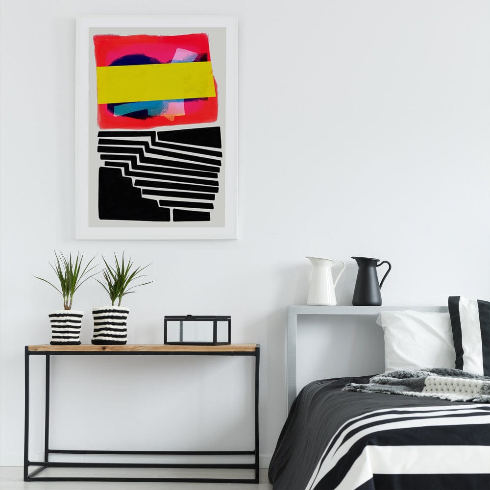 Our Temple Sunrise abstract art print features a bold yellow band over expressive red, blue, and pink digital brushwork, anchored by graphic black stepped shapes beneath. The composition suggests movement and ascent, calling to mind the steps of a temple at sunrise. A strong piece of abstract wall art that works especially well when made large. It also pairs especially well with ‘Sunset Shadows’ and other prints from our abstract collection.
