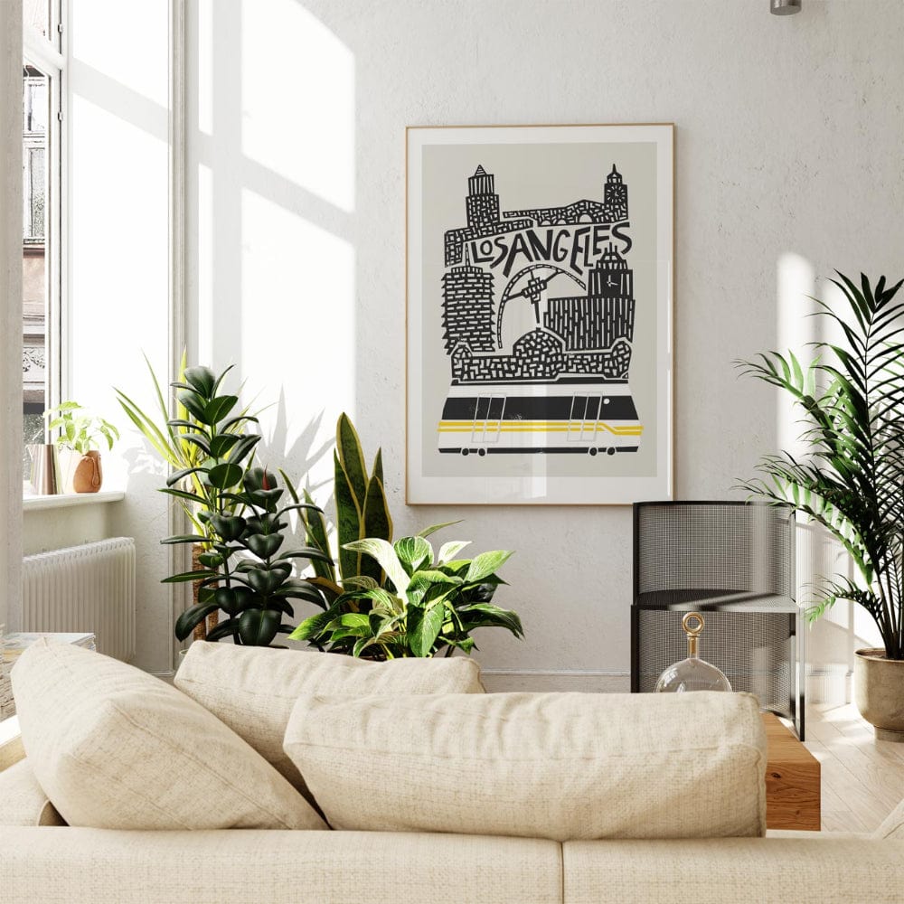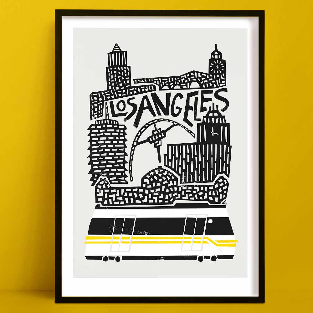 The home of Mid-Century-Modern, it was a delight to draw this city for our Los Angeles print. Featuring icons like the TWA Flight Center, with the Metro train to keep you moving, it's the perfect way to remember this amazing city. Part of our city collection.